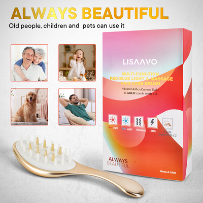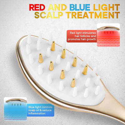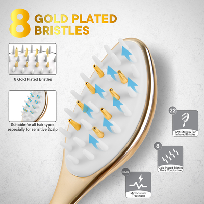 Błyszcząca złote pędzel do włosów z mikrokrądem EMS i leczenie światła LED łączy zaawansowane technologie w celu kompleksowej pielęgnacji włosów i skóry głowy.